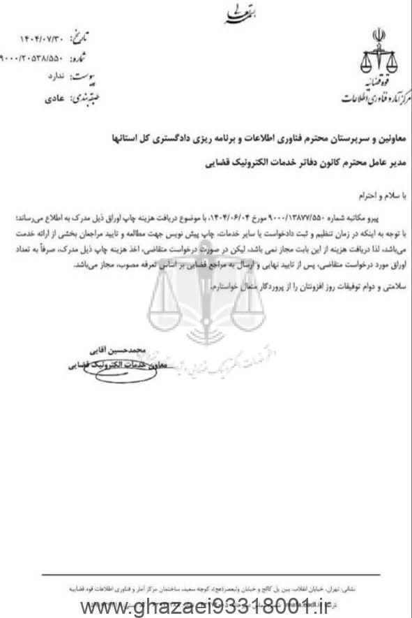 بخشنامه شماره 9000/20538/550 مورخ 1404/07/30 مرکز آمار و فناوری اطلاعات قوه قضائیه در خصوص دریافت بهای اوراق در دفاتر خدمات الکترونیک قضایی