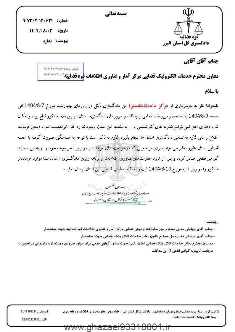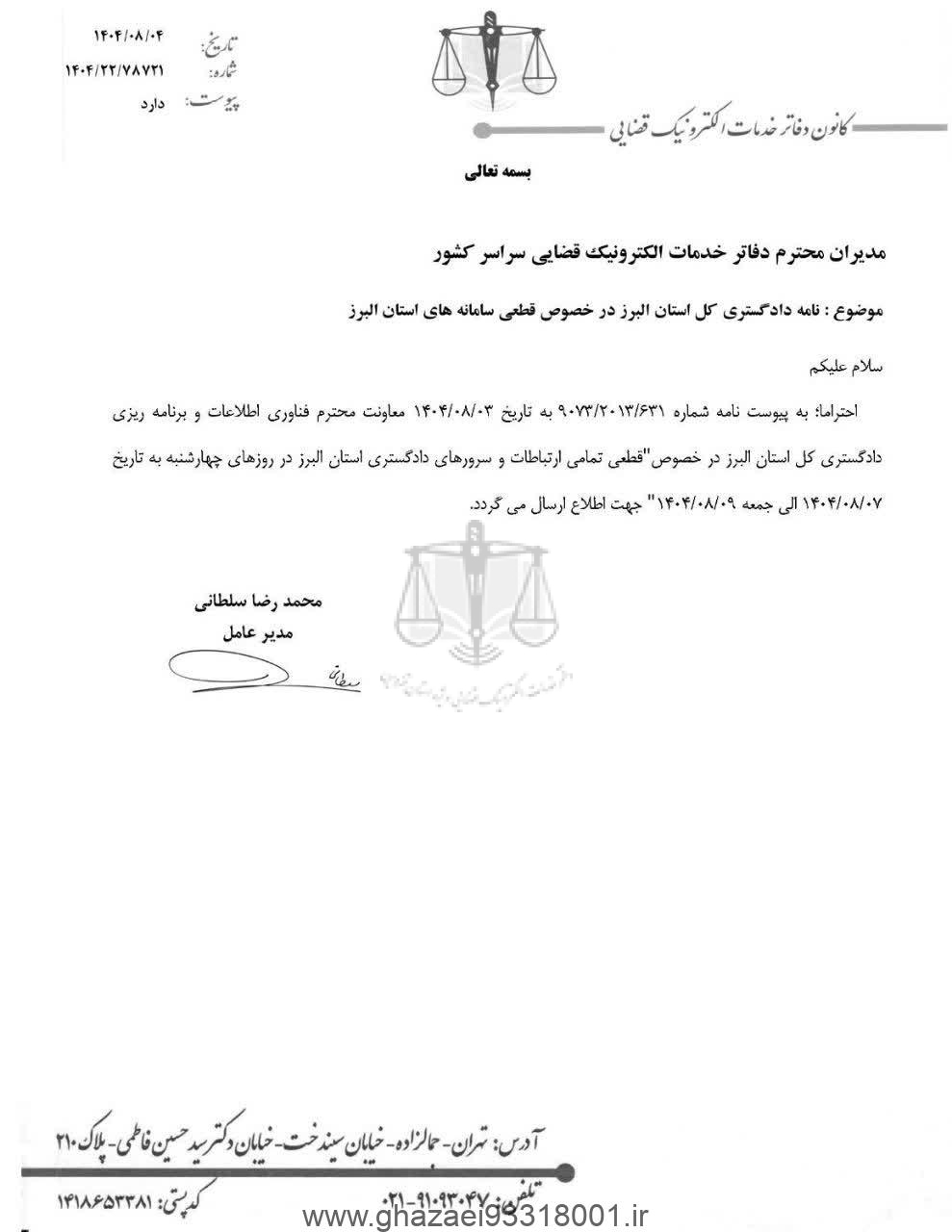 بخشنامه شماره 1404/22/78721 مورخ 1404/08/04 کانون دفاتر خدمات الکترونیک قضایی در خصوص ارسال نامه دادگستری کل استان البرز در مورد قطعی سامانه های استان البرز