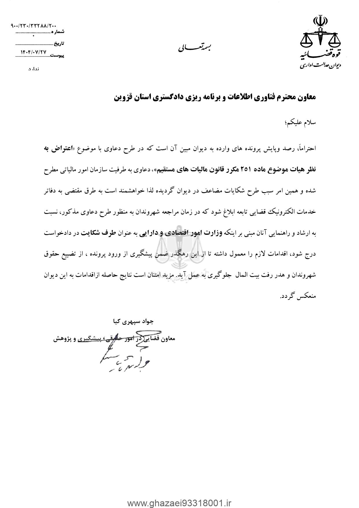 بخشنامه شماره 9031/49528/1 1404/08/10 معاونت فناوری اطلاعات و برنامه ریزی دادگستری کل استان قزوین در خصوص اعتراض به نظر هیئت موضوع ماده 251 مکرر قانون مالیات های مستقیم