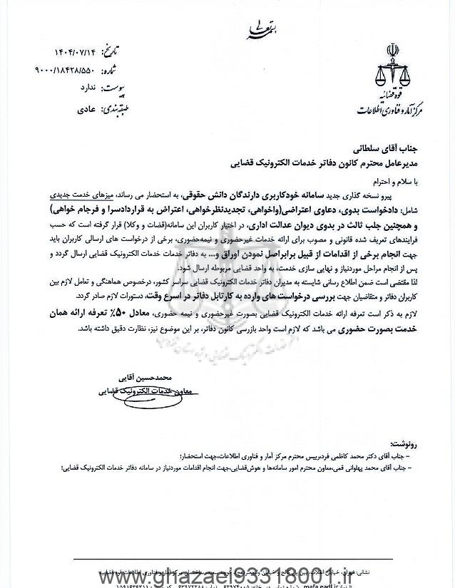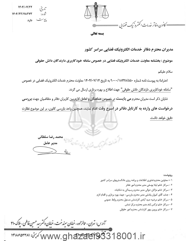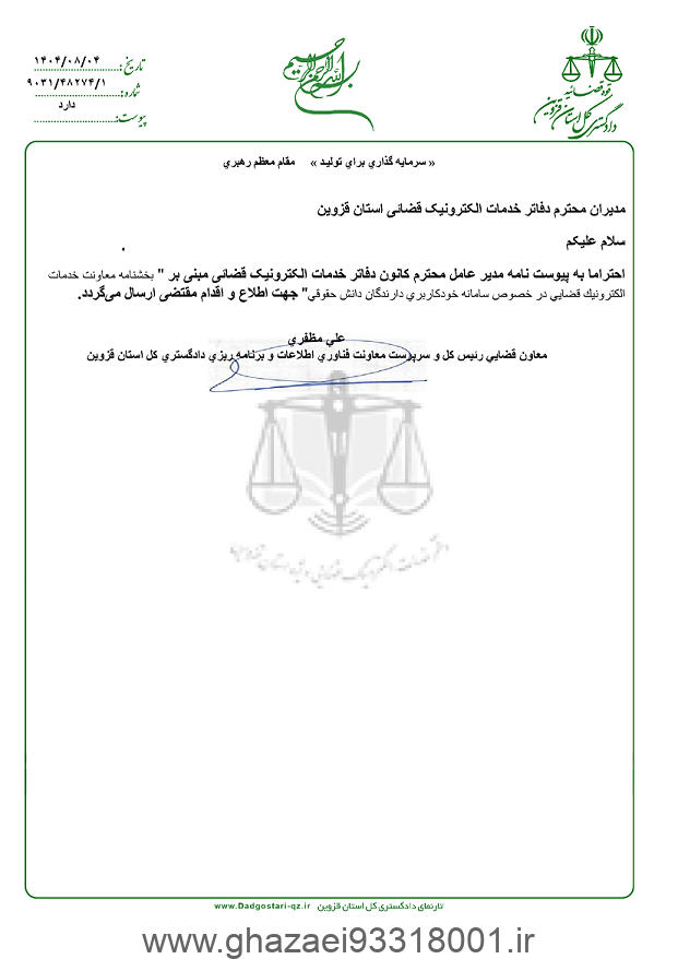 بخشنامه شماره 9031/48274/1 مورخ 1404/08/04 معاونت فناوری اطلاعات و برنامه ریزی دادگستری کل استان قزوین در خصوص خودکاربری دارندگان دانش حقوقی