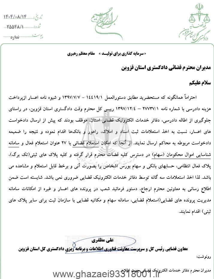 بخشنامه شماره 25548/1 مورخ 1404/08/14 معاونت فناوری اطلاعات و برنامه ریزی دادگستری کل استان قزوین در خصوص حذف اخذ استعلامات سه گانه در دفاتر خدمات الکترونیک قضایی استان قزوین