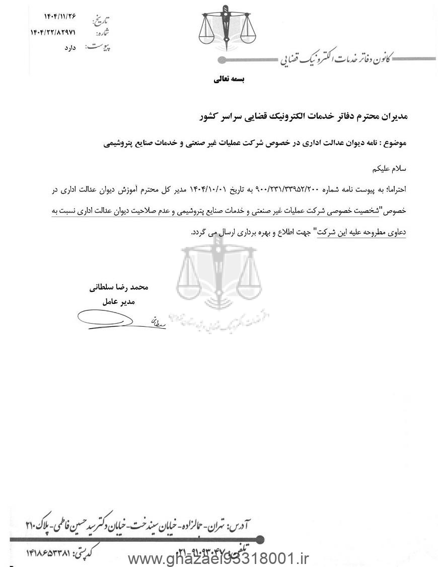 بخشنامه شماره 1404/22/82971 مورخ 1404/11/26 کانون دفاتر خدمات الکترونیک قضایی در خصوص ارسال نامه دیوان عدالت اداری در خصوص شرکت عملیات غیر صنعتی و خدمات صنایع پتروشیمی